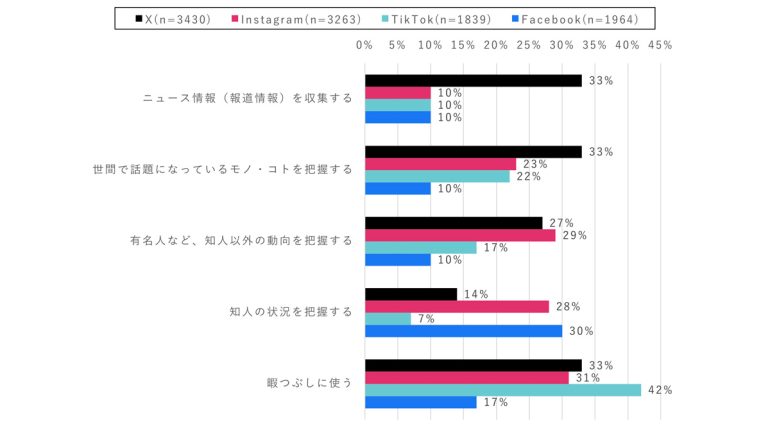図3はそれぞれのSNSを利用している人たちを対象に、そのSNSの使い方を聞いた結果だ。X、Instagram、TikTokは「暇つぶし」の利用も多く、特にTikTokは、最も多い使い方が「暇つぶし」となっていた。暇つぶし以外では、Xは比較的まんべんなく使われているが、「ニュース情報(報道情報)を収集する」と「世間で話題になっているモノ・コトを把握する」は他のSNSに比べ10ポイント以上高くなっていた。