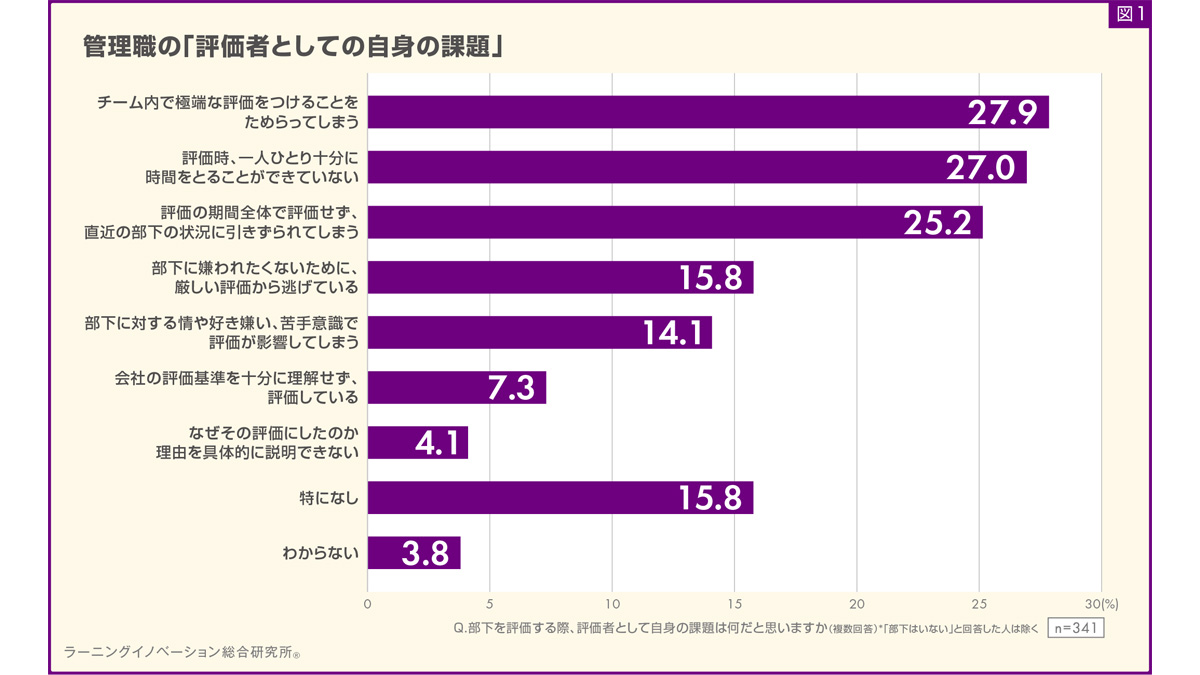 結果、「チーム内で極端な評価をつけることをためらってしまう」と回答した割合が27.9%と、最大の割合になった。次に、「評価時、一人ひとり十分に時間をとることができていない」が27.0%、「評価の期間全体で評価せず、直近の部下の状況に引きずられてしまう」が25.2%となった(図1)。