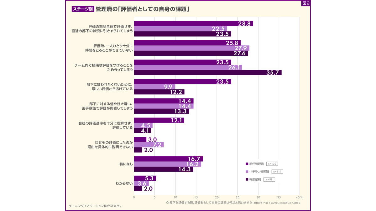 幹部候補では、「チーム内で極端な評価をつけることをためらってしまう」の割合が35.7%と最も高く、他ステージと比べて突出していた。以下「評価時、一人ひとり十分に時間をとることができていない」(27.6%)、「評価の期間全体で評価せず、直近の部下の状況に引きずられてしまう」(23.5%)と続いた(図2)。