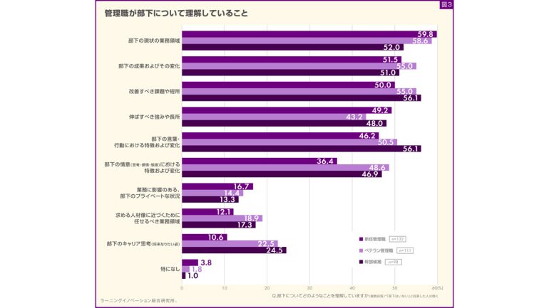 ベテラン管理職では、「部下の現状の業務領域」が58.6%と最も高く、次に「部下の成果およびその変化」「改善すべき課題や短所」が同率で55.0%となった。