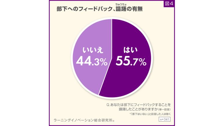 部下がいる管理職に、フィードバックすることを躊躇(ちゅうちょ)したことがあるかと質問したところ、半数以上が「はい」と回答する結果となった(図4)。