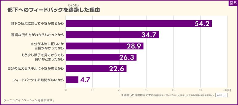 結果、「部下の反応に対して不安があるから」と回答した割合が54.2%と最も高くなった。以下、「適切な伝え方がわからなかったから」(34.7%)、「自分が本当に正しいか自信がなかったから」(28.9%)と続いた(図5)。