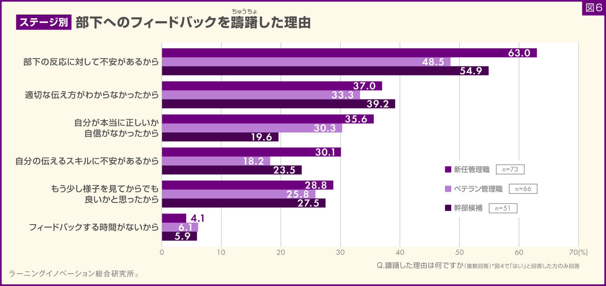 幹部候補では「部下の反応に対して不安があるから」(54.9%)が最も高く、以下「適切な伝え方がわからなかったから」(39.2%)、「もう少し様子を見てからでも良いかと思ったから」(27.5%)と続いた。「適切な伝え方がわからなかったから」の回答は、他のステージと比較して最大の割合となった(図6)。