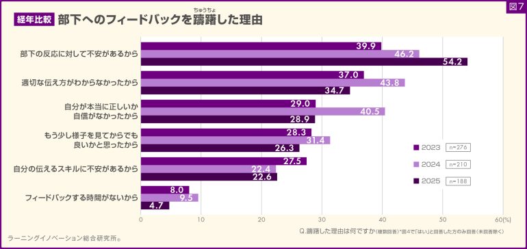 さらに、2023年から3年間、各年度の管理職の回答を見たところ、「部下の反応に対して不安があるから」は3年連続でトップとなった。加えてその回答割合は連続で増加しており、今年は初めて半数を超える結果となった(図7)。
