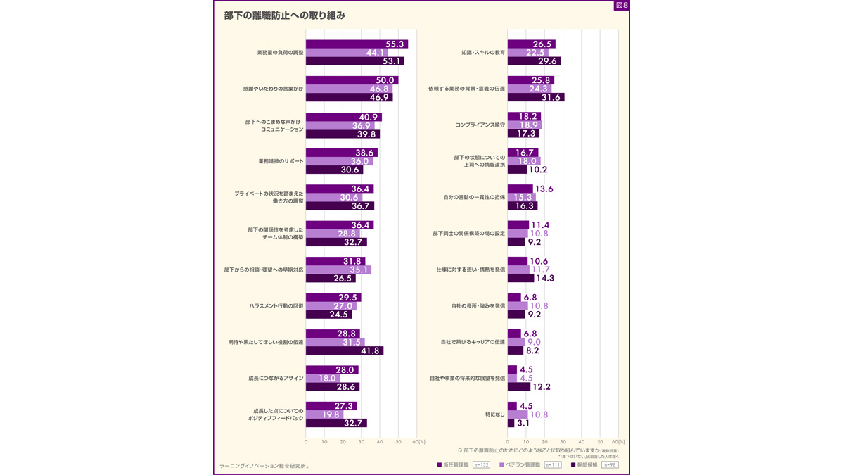 結果、新任管理職は「業務量の負荷の調整」が55.3%と最も高く、次に「感謝やいたわりの言葉がけ」が50.0%となった。