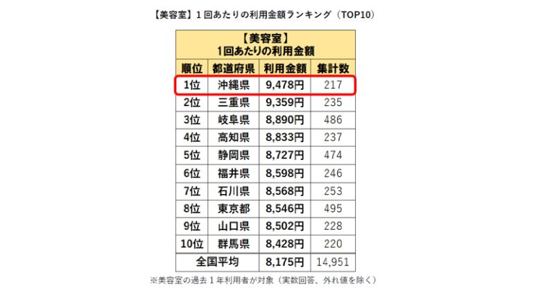 調査トピック1:美容室1回あたりの利用金額は、沖縄県が9,478円で全国1位