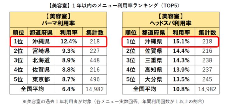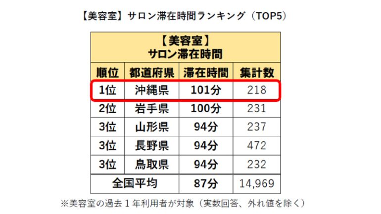 沖縄県では、パーマの利用率が12.4%、ヘッドスパが15.1%といずれも全国1位。高単価メニューの利用が、1回あたりの利用金額を押し上げていると考えられる。サロン滞在時間も平均101分と全国最長で、「1回でしっかり整える」スタイルが浸透していることがうかがえる。