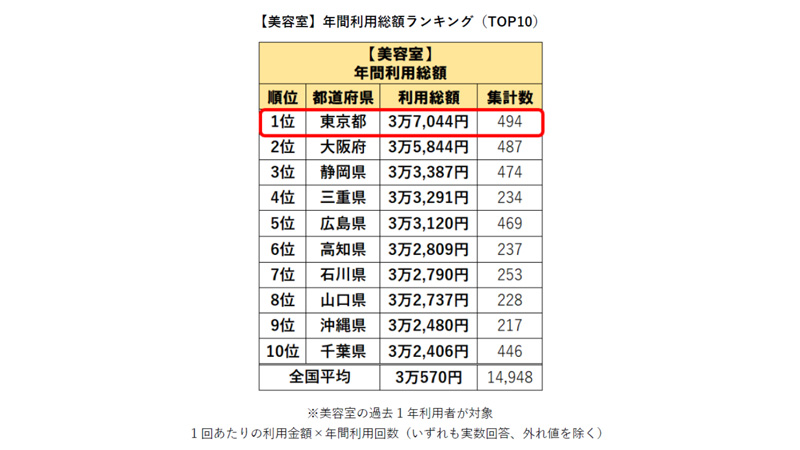 多くの女性が定期的に通う美容サロン。その利用金額に地域差はどれくらい存在するのだろうか?