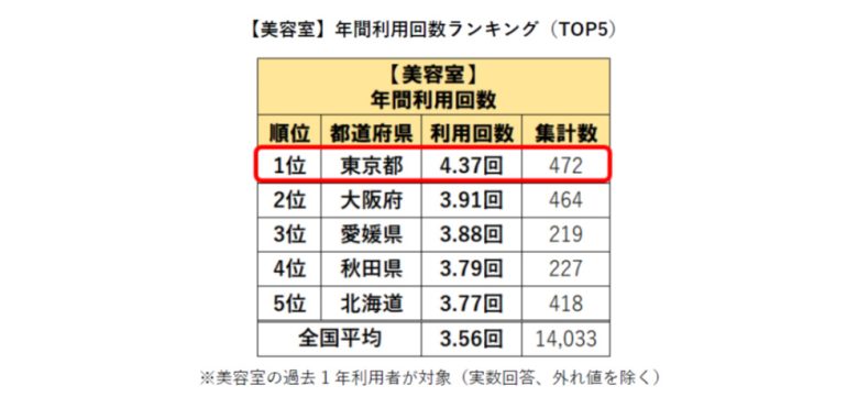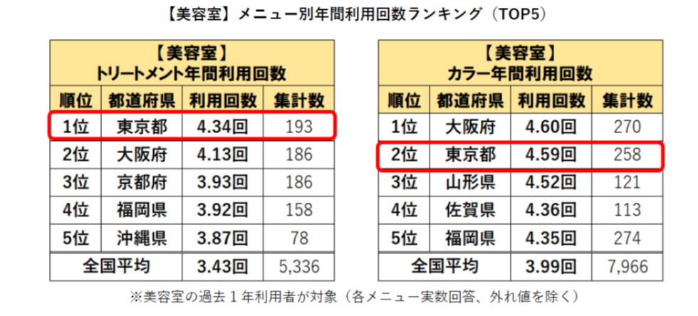 東京都はカラー(年間4.59回)やトリートメント(同4.34回)といったメニューの利用頻度が全国でも特に高く、美容室の年間利用回数(4.37回)は全国1位となった。髪色のキープやダメージケアなど、定期的な施術が欠かせないメニューの人気の高さが、利用総額の高さにも影響しているものとみられる。