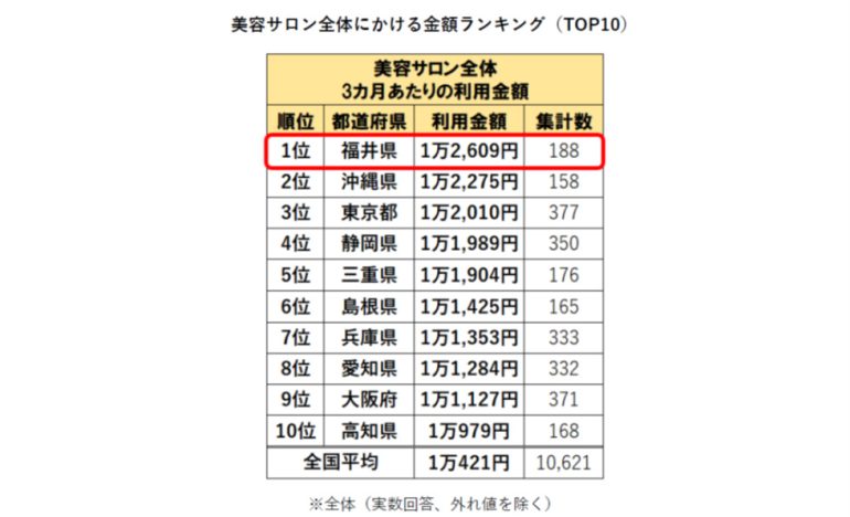調査トピック3:美容サロン全体にかける金額は、福井県が3カ月あたり1万2,609円で全国1位