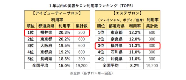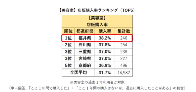 アイビューティー(20.3%)、エステ(11.3%)などさまざまなジャンルのサロン利用率が全国上位となったのは福井県。美容室での店販購入率(店舗で販売されている商品の購入割合)も38.2%と全国1位であり、施術だけでなくホームケアへの投資も活発だ。