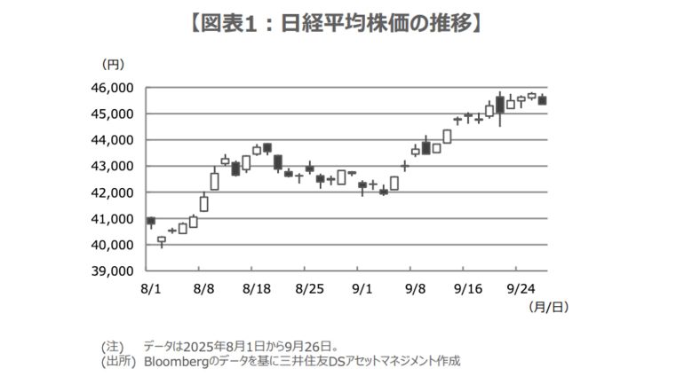 日経平均株価は9月上旬に4万1800円台で下値を固めた後、上昇に転じ、節目となる4万4000円、4万5000円を次々に突破し、過去最高値更新が続く展開となった(図表1)。