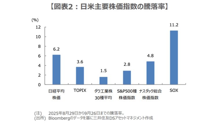 なお、8月29日から9月26日までの上昇率について、日経平均は前述のとおり6.2%に達しているが、東証株価指数(TOPIX)は3.6%にとどまっている。