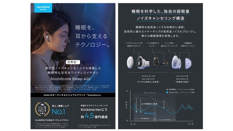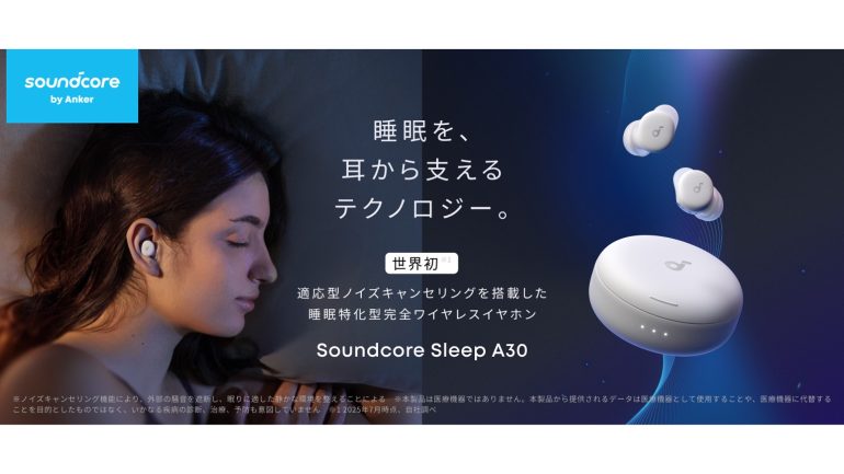 デジタル関連製品の世界的トップブランド、Ankerグループの⽇本法⼈であるアンカー・ジャパンは、同社が展開するオーディオブランド<Soundcore>より、睡眠特化型の完全ワイヤレスイヤホン「Sleep A30」の発売を2025年9⽉25⽇より開始した。価格は2万9990円(税込)。