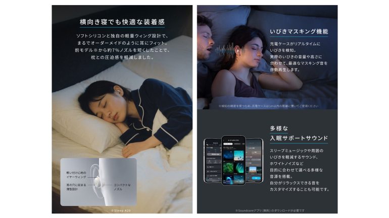 装着時の快適さも徹底的に追求し、数千⼈の⽿道や形状を分析して⽣まれたフィット感へのこだわりや、指先に乗る⼩さなサイズと約3gの軽さに加え、前モデル(Sleep A20)に⽐べてイヤホン本体を薄型にすることで、横向き寝でも圧迫感や枕との⼲渉を軽減。朝まで快適に使うことができる。
