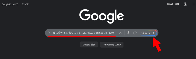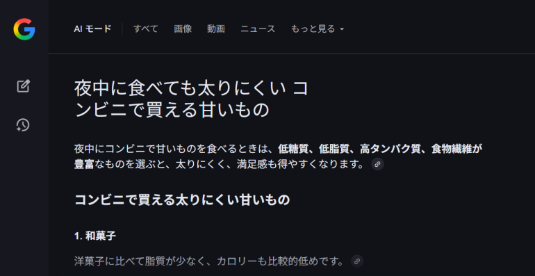 Google検索のAIモードは、複雑な内容の質問や検索に対し、検索エンジン内の関連情報を収集し、結論をまとめてくれる機能。例えば、画像のようにAIモードで「夜中に食べても太りにくい コンビニで買える甘いもの」と検索すると、どのような栄養素のものを選ぶと良いのか、また「和菓子」「高カカオチョコレート」などの具体案も回答してくれる。