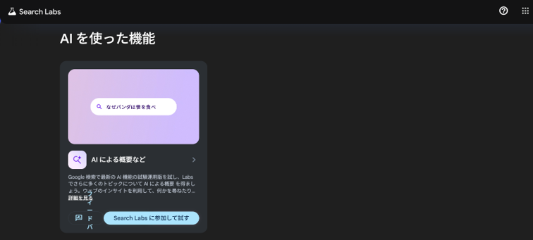 PCの場合はSearch Labsにアクセスし「AIを使った機能」の項目にある「Search Labsに参加して試す」をクリック。