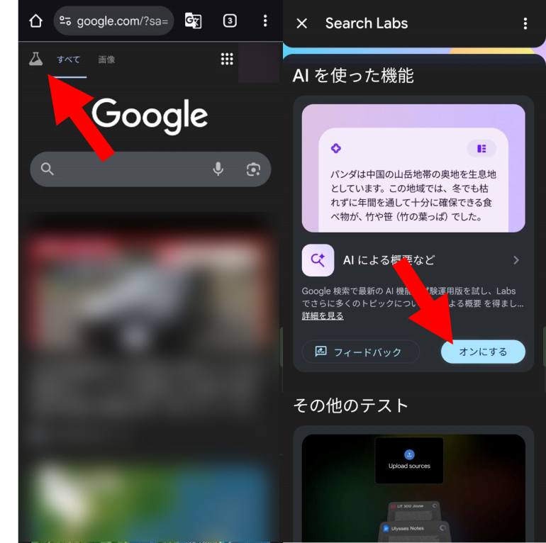 スマホの場合はGoogle検索エンジンにアクセス・ログインし、画面左上に表示されているLabsアイコンをタップ。「AIを使った機能」の項目をオンにする。