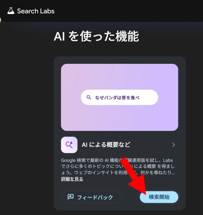 PCの場合はSearch Labsの「AIを使った機能」の項目にある「検索開始」をクリックしよう。