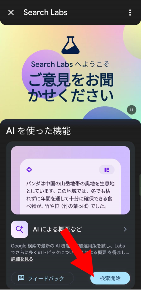 スマホでの操作もPCと同様にSearch Labsの「AIを使った機能」の項目にある「検索開始」をタップする。