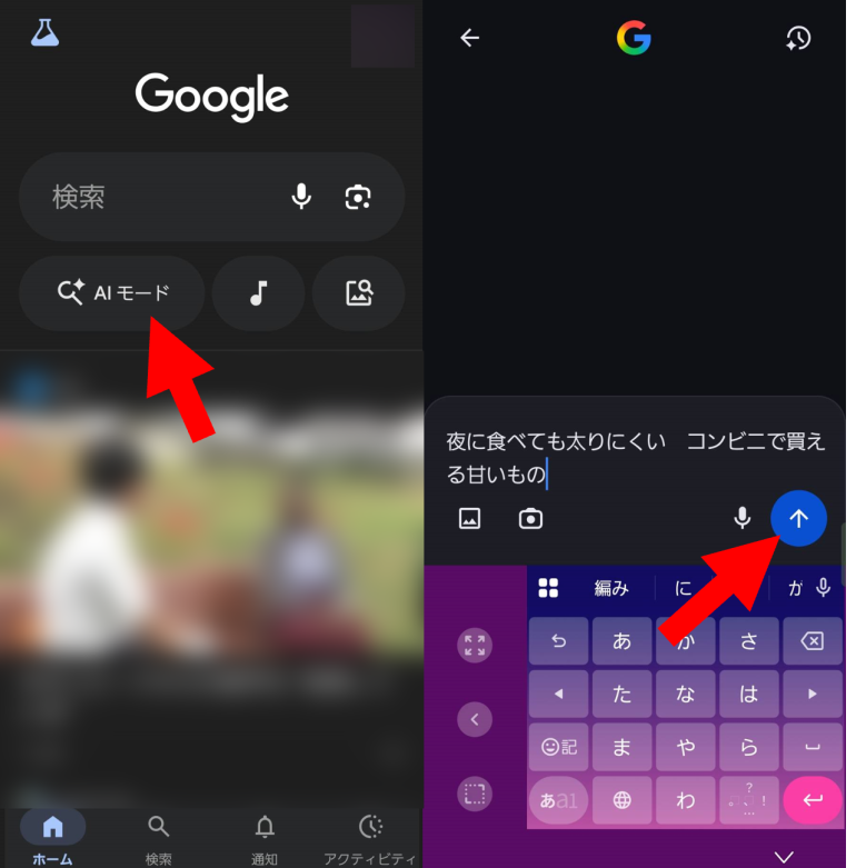 スマホ操作の場合は検索ボックスの下にある「AIモード」をタップして知りたい内容を入力。「↑」をタップすると回答が表示される。