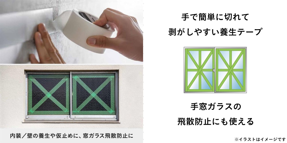 「窓ガラスに放射状に貼って飛散防止に使えます。手で簡単に切れて、強い粘着力でありながら、貼ってはがせる仕様になっています」