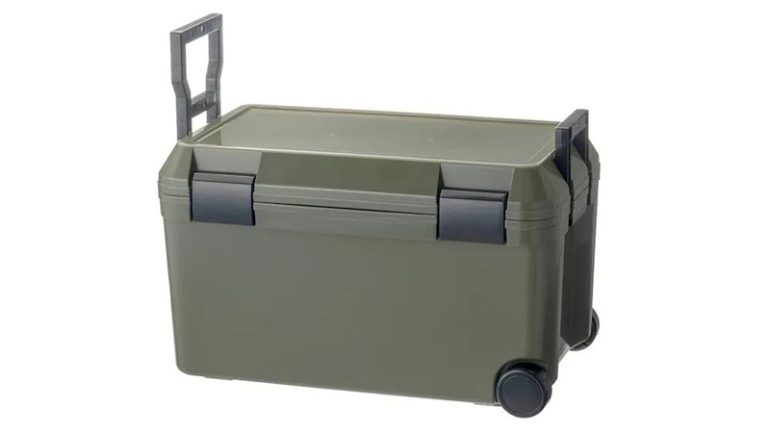 「46Lの大容量のクーラーボックスです。側面には大型の取っ手が付いており、両手での持ち運びがしやすい仕様になっています。また、キャスターが付いているので、転がして楽に運搬できます。アウトドアにもマッチしたグリーンのカラーリングですので、レジャー用としても使いやすくなっています」