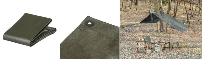 「定番のブルーシートに、より目立たずにお使いいただけるグリーンのカラーが登場しました。こちらは耐候材入りで屋外使用目安が2年と長持ちします。11サイズとサイズ展開も豊富で、レジャーシートとしても使えますし、ハトメ加工でロープ固定もラクに行えるので、アウトドアでの日よけとしても使えます」