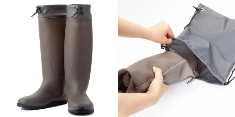 「コンパクトに折りたためて、車のトランクや、ご自宅のシューズロッカーに収納いただけます。折りたたんだ長靴を入れられる収納袋付きです。M~3Lまでの4サイズがあります」