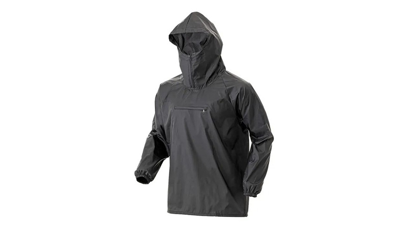 「水を弾きやすい撥水加工を施したヤッケです。カラーはブラック・ブルーの2色。M~3Lまでの4サイズを用意しています。同色のパンツもありますので、上下セットアップで着用することができます」
