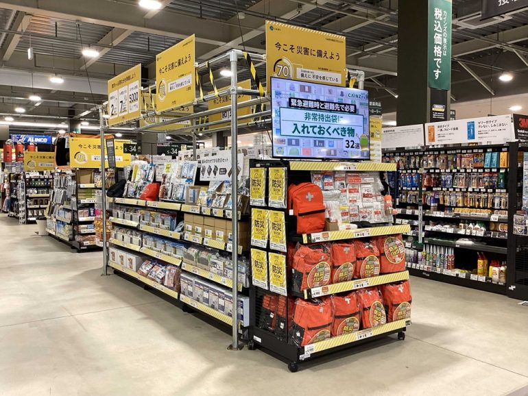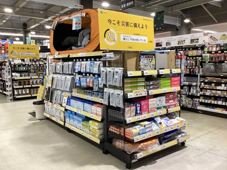 停電や断水、避難の際に役立つ防災バッグや、備蓄水、長期保存ができる「非常食・保存食」も、カインズでは多く取り扱っている。
