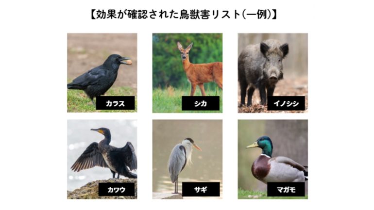 カラス、ハトなどの鳥類、イノシシやシカ、さらにカワウ・サギ・ハクビシンなど、多様な鳥獣に対する忌避効果が確認されている。水田、果樹園、山林、湖など様々な環境での実証実験でも高い有効性を示したという。