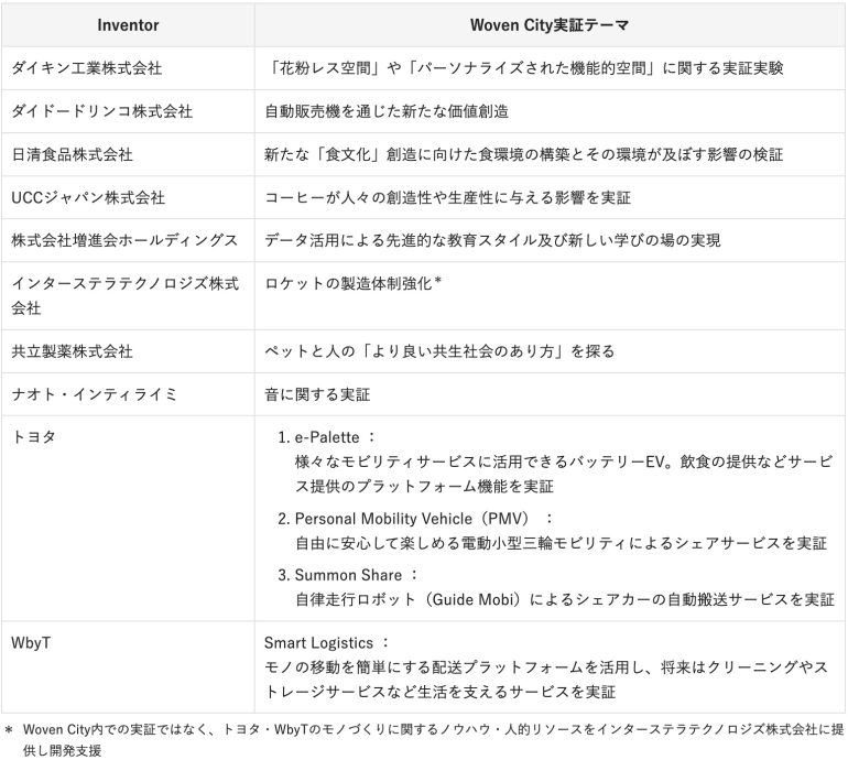 このWoven Cityを活用して新しいプロダクトやサービスを開発・実証する企業・個人は、Inventors(インベンター/発明家)と呼ばれている。トヨタのものづくりの知見やWbyTのソフトウェア技術、そして各Inventorが持つ様々な強みや専門性といった、自分たちが持っていないものを掛け合わせることで、いまは存在しない価値をつくり出していく。それが、Woven Cityが目指す「カケザン」による発明。