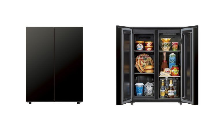 奥行450mmのコンパクト設計ながら冷蔵室と冷凍室を備え、小スペースで開閉できるフレンチドアを採用。また、家具調の脚を持ち、フラットな天板には電子レンジやオーブンレンジのようなキッチンアイテムの設置はもちろんのこと、キャビネットやサイドボードのように照明や雑貨などをディスプレイすることができる。