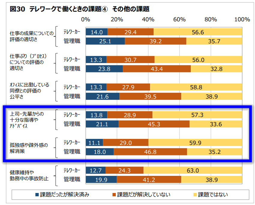 複数の意識調査では、十分な指導やアドバイスが受けられない、孤独感や疎外感が解消しないという悩みを持つのは管理職の割合が大きい。マネージャーとして率先して、「ウォータークーラー効果」を狙いたい。
