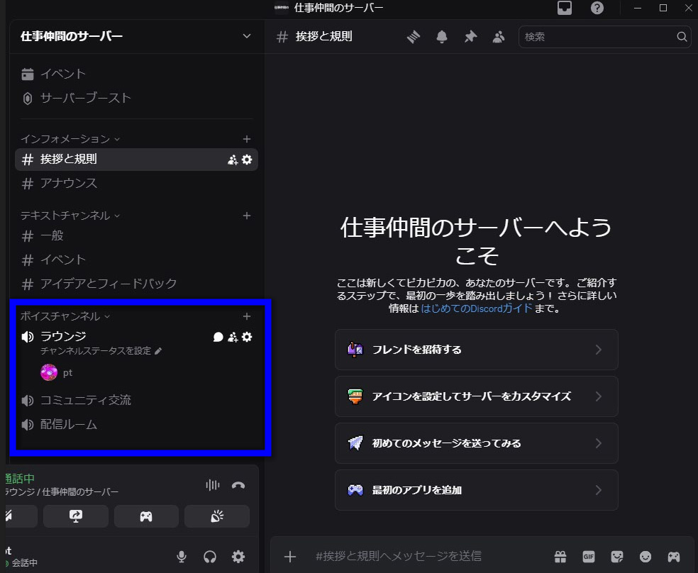 「会話は『始める』ものではなく、『そこにある』もの」という思想で、例えばTeamsのコールや、Slackのハドルは、相手を呼び出すイベントだが、Discordのボイスチャットは常設された空間である。「ボイスチャット-雑談部屋」のようになっていて、誰かがいるのを見て、ふらっと立ち寄る、という使い方が基本となる。これは、リモートワークで失われた「隣の席の同僚や部下への声かけ」の如く、偶発的な会話が生まれやすく、チームに緩やかな連帯感をもたらしてくれる。