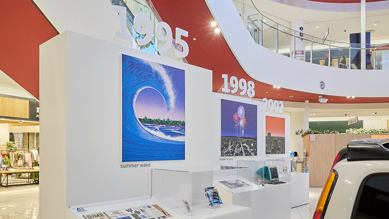 今回の30周年イベントのキービジュアルを手掛けているのは、独特の色彩とノスタルジックな雰囲気で知られるイラストレーター・永井博氏。展示されたムーヴの年代に合わせ、当時描かれた永井氏の作品が展示されています。ムーヴ30周年の歴史と重なるように、永井氏の作品を象徴する夏の風景が会場を彩り、訪れた人々を惹きつけていました。