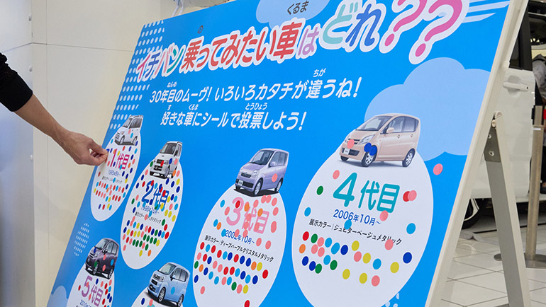 さらに、歴代ムーヴの中から「お気に入り」に投票すると、ムーヴオリジナルの風船がもらえる仕掛けも用意されていて、ムーヴを懐かしむ大人から、小さな子どもまで、思い思いにお気に入りのムーヴを選んでいました。
