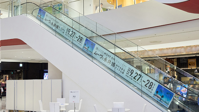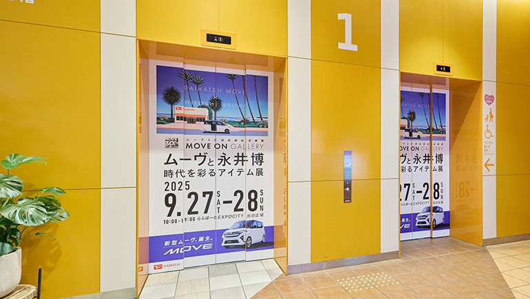 会場はもちろん、ららぽーとEXPOCITYのエスカレーターやエレベーター扉もイベントビジュアルでジャック! 館の中央で行われている「MOVE ON GALLERY」への導線を盛り上げていました。