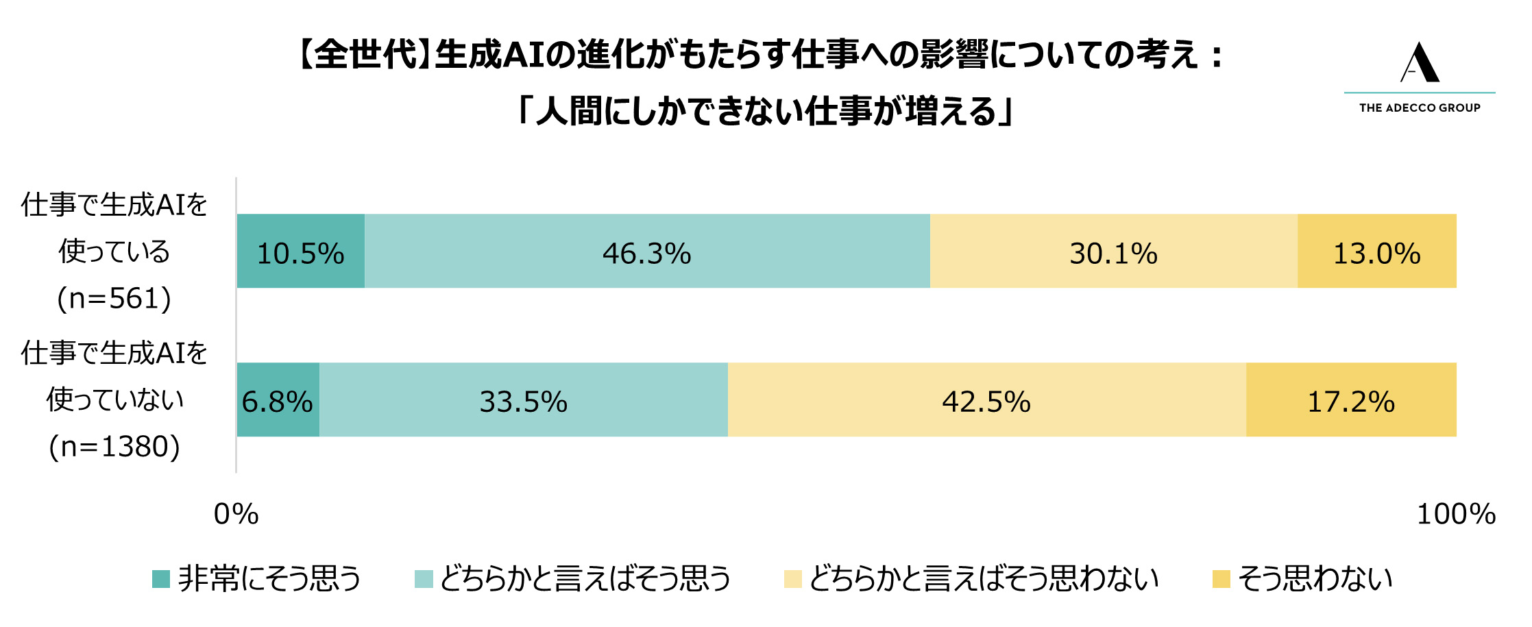 生成AIの進化により、「人間にしかできない仕事が増えると思うか」という質問をしたところ、仕事で生成AIを利用している働き手の56.8%が、「そう思う」(非常にそう思う 10.5%、どちらかと言えばそう思う 46.3%)と回答した。一方、生成AIを利用していない働き手で「そう思う」と回答したのは40.3%(非常にそう思う 6.8%、どちらかと言えばそう思う 33.5%)で、生成AIの利用者ほど、人間にしかできない仕事が増えると考えていることがわかった。
