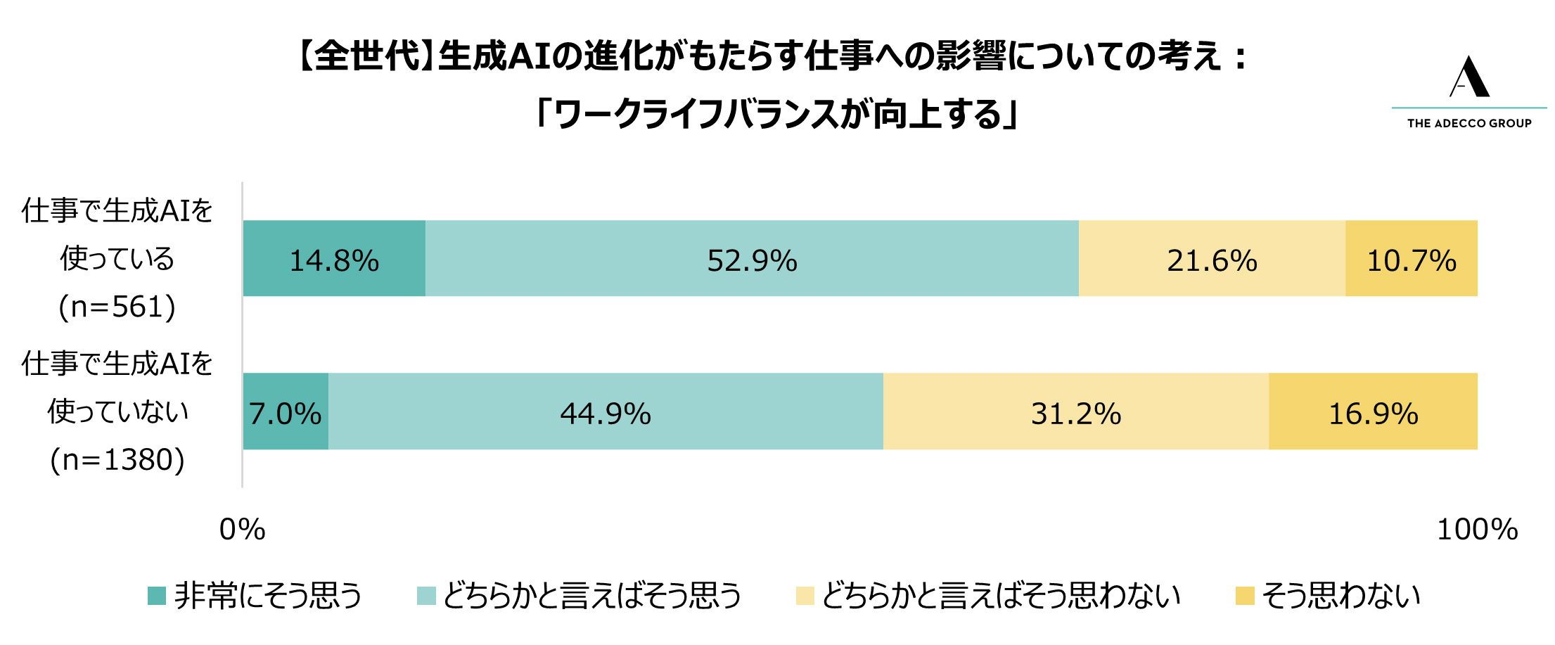 続いて、生成AIの進化により、「ワークライフバランスが向上すると思うか」という質問をしたところ、仕事で生成AIを利用している働き手の67.7%が、「そう思う」(非常にそう思う 14.8%、どちらかと言えばそう思う 52.9%)と回答した。一方、生成AIを利用していない働き手で「そう思う」と回答したのは、51.9%(非常にそう思う 7.0%、どちらかと言えばそう思う 44.9%)となった。