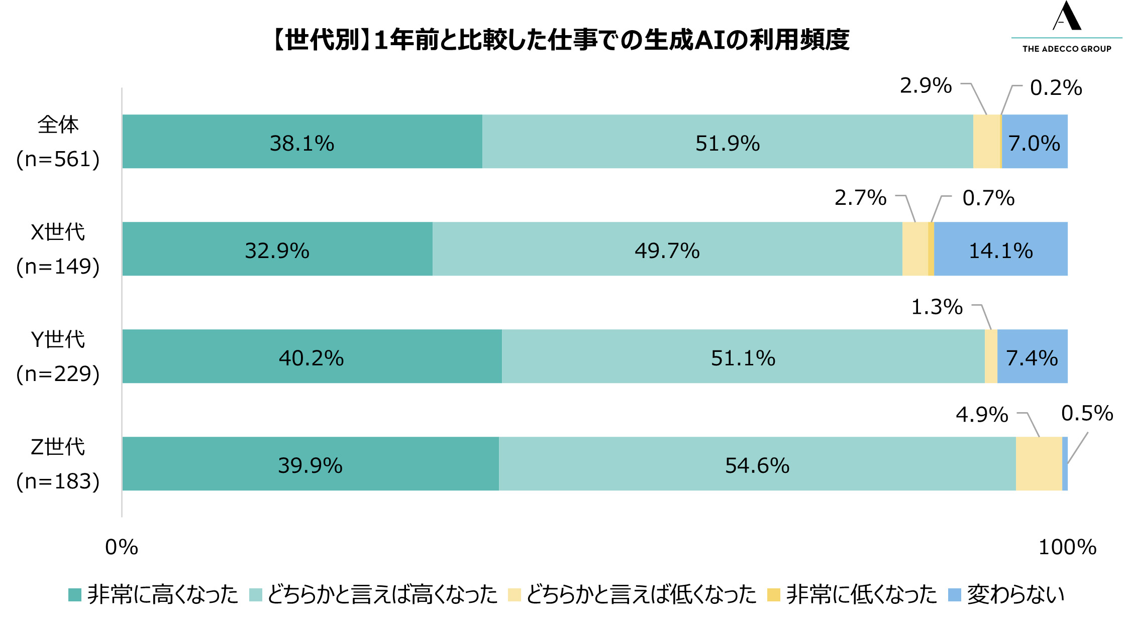 仕事で生成AIを利用していると回答した全国のX世代・Y世代・Z世代の働き手561人(X世代149人、Y世代229人、Z世代183人)に対し、「1年前に比べて、生成AIを使う頻度はどのように変わったか」という質問をしたところ、90.0%が「高くなった」(非常に高くなった 38.1%、どちらかと言えば高くなった 51.9%)と回答した。