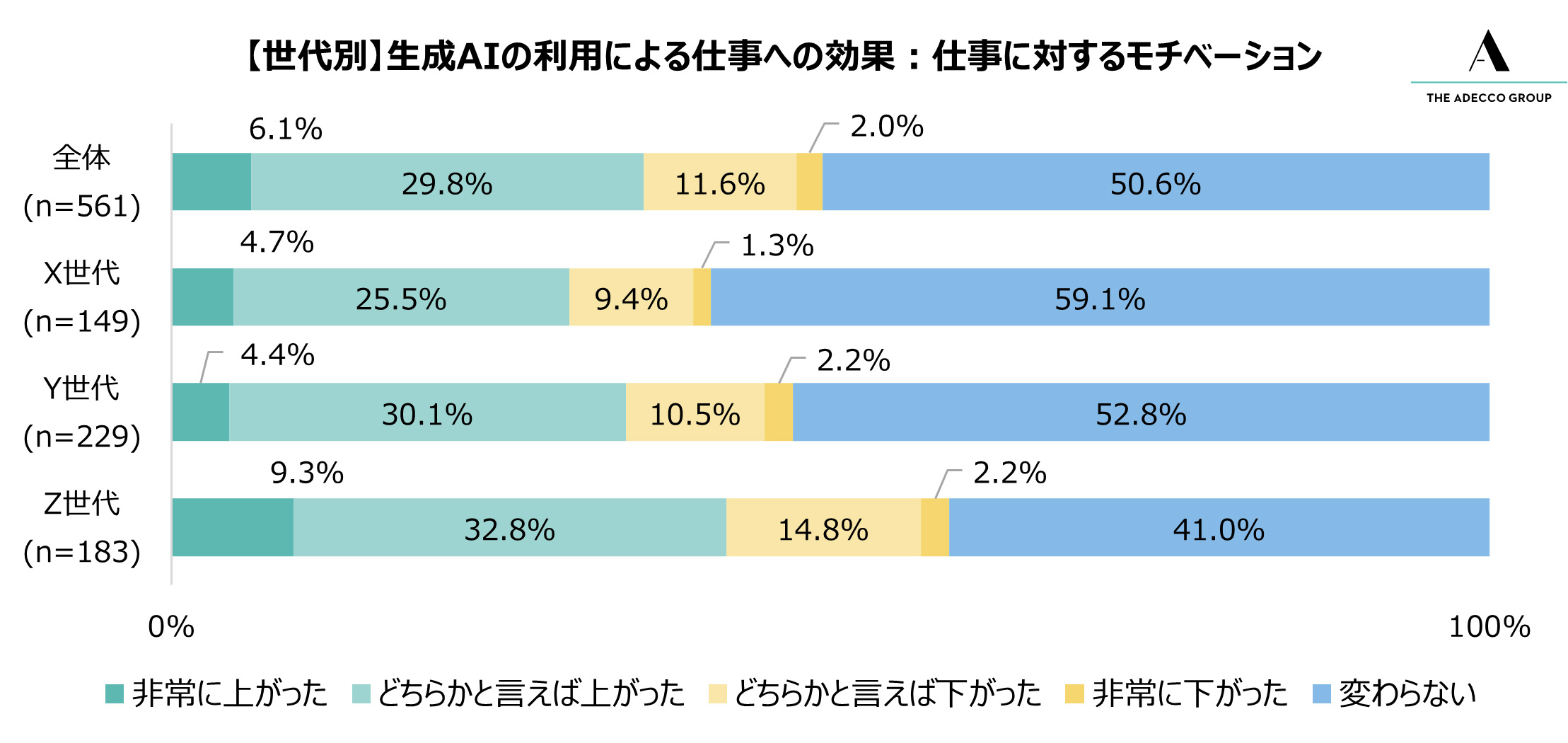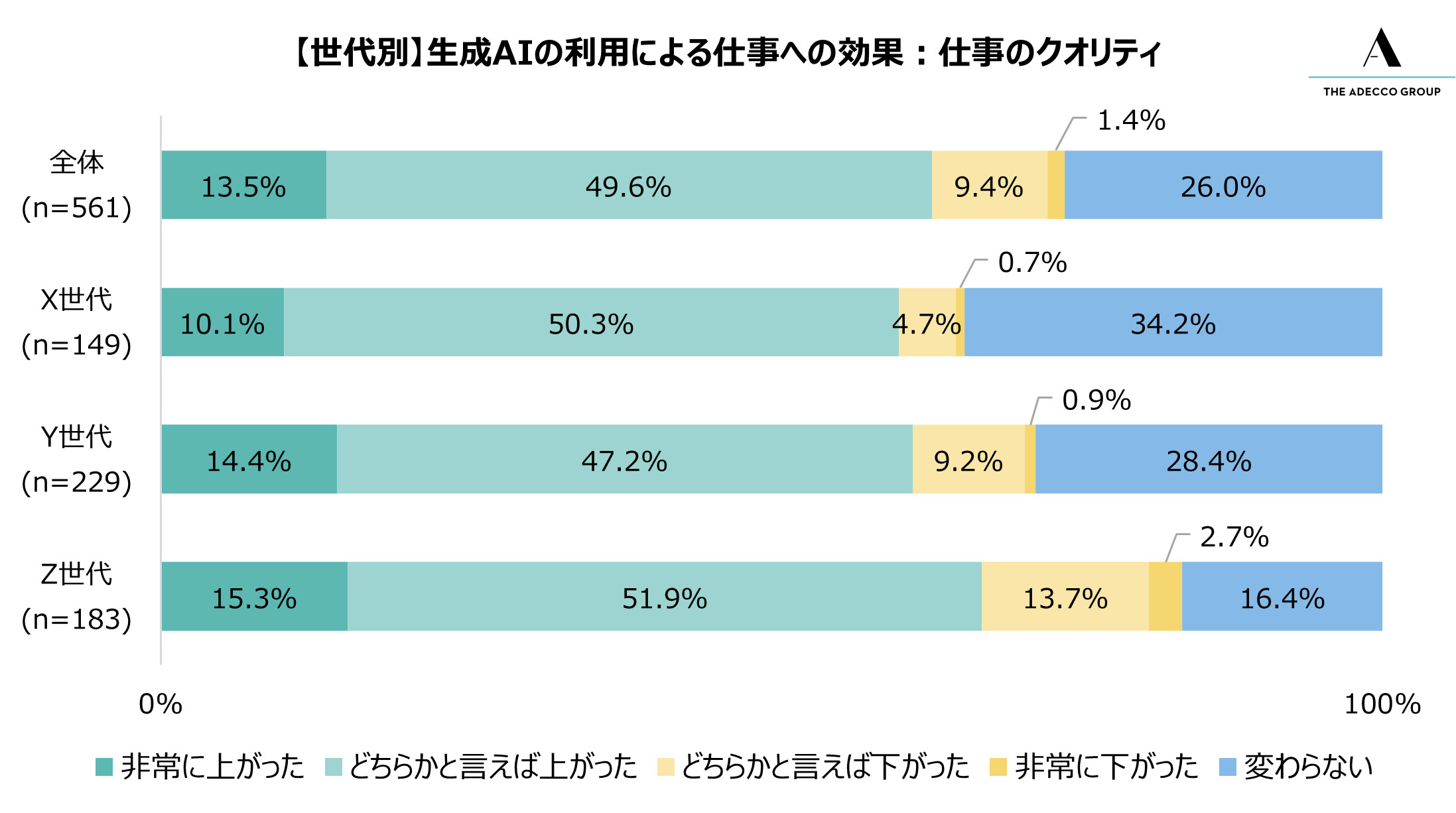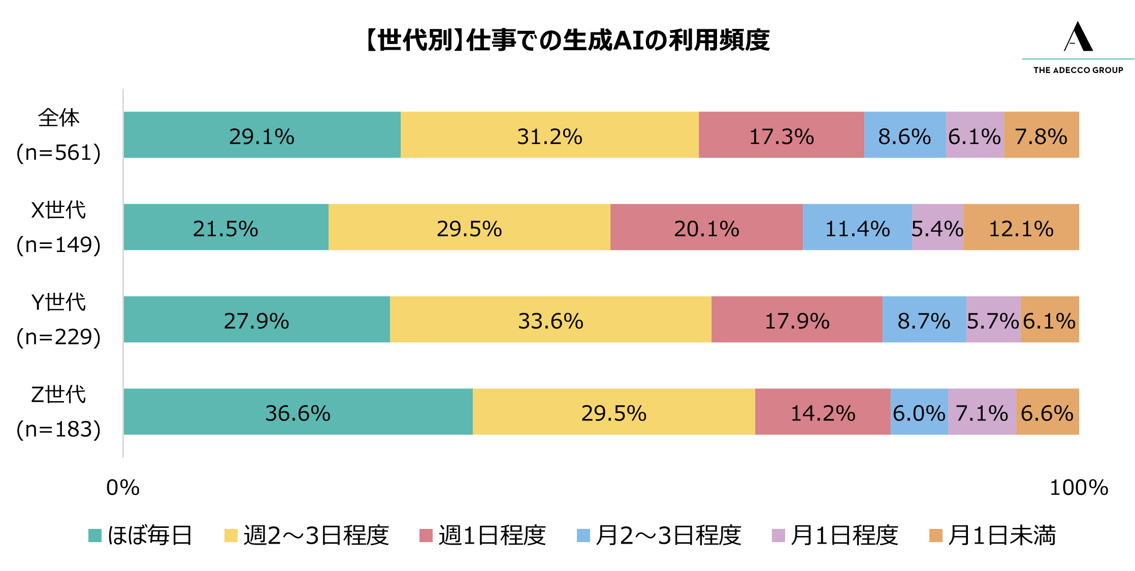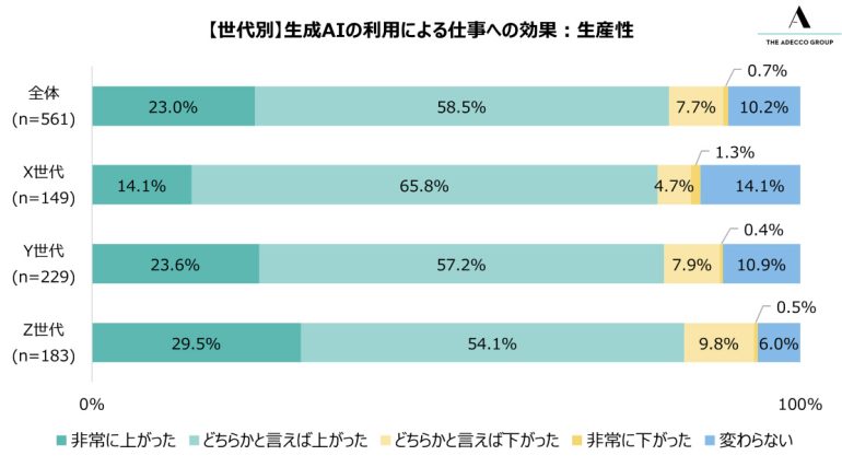 アデコはこのほど、全国のX世代・Y世代・Z世代の働き手2,050人(X世代750人、Y世代800人、Z世代500人)を対象に、仕事における生成AIの利用状況や、今後の仕事および生活への影響、生成AIの利用がもたらす仕事への効果などについて、意識調査を実施し、その結果を発表した。