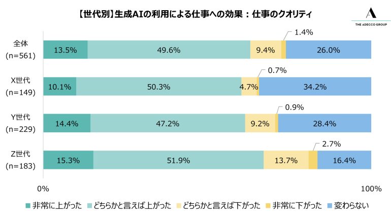 仕事で生成AIを利用していると回答した全国のX世代・Y世代・Z世代の働き手561人(X世代149人、Y世代229人、Z世代183人)に対し、仕事で生成AIを利用することにより、「仕事のクオリティ」、「生産性」、「仕事に対するモチベーション」、「上司・同僚とのコミュニケーション」、そして「自身のキャリアへの意識」という5つの項目について、それぞれどのような効果があったかを質問した。