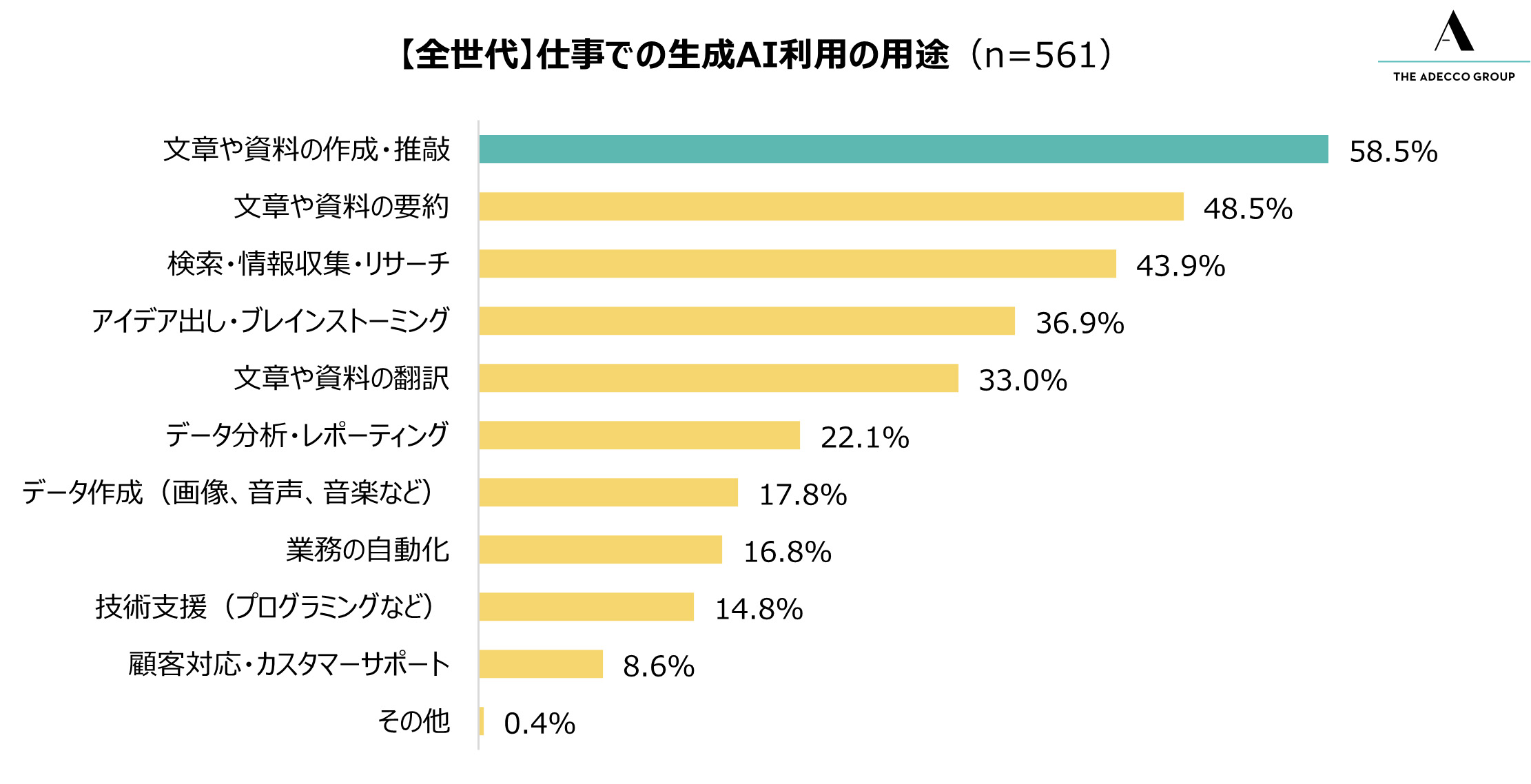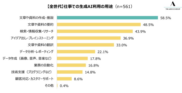 仕事で生成AIを利用していると回答した全国のX世代・Y世代・Z世代の働き手561人に対し、「どのような用途で生成AIを使っているか」という質問をしたところ、もっとも多かった用途は、「文章や資料の作成・推敲」(58.5%)となった。