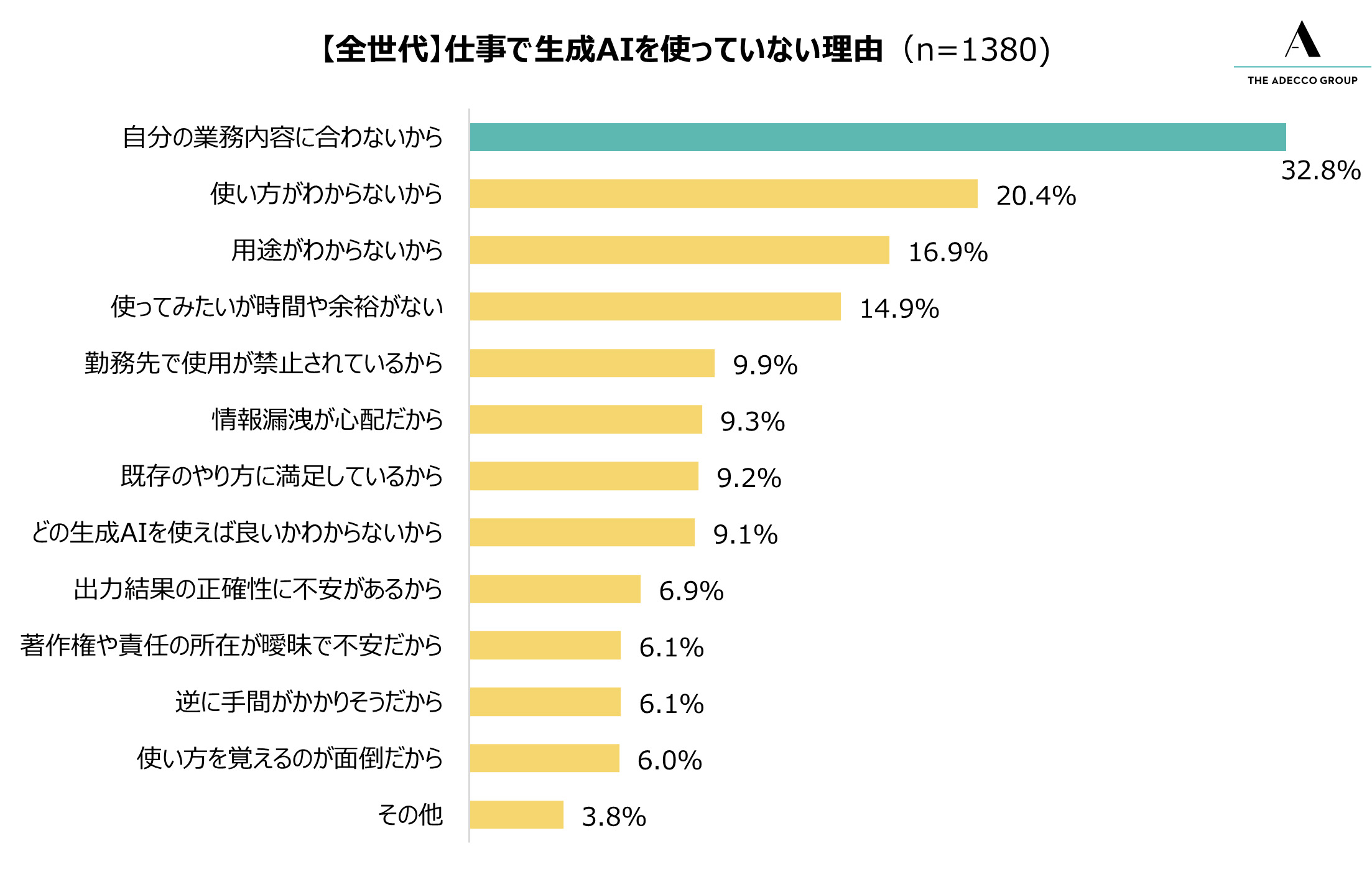 仕事で生成AIを利用してないと回答した全国のX世代・Y世代・Z世代の働き手1,380人に対し、利用していない理由を尋ねたところ、その理由としてもっとも多かったのは、「自分の業務内容に合わないから」(32.8%)となった。