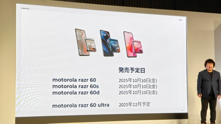 レノボ傘下のモトローラ・モビリティ・ジャパンは、新たな縦折りスマホ「motorola razr 60」シリーズの日本展開を発表。スタンダードモデルのmotorola razr 60は10月10日、上位モデルのmotorola razr 60 ultraは2025年12月に発売となる。