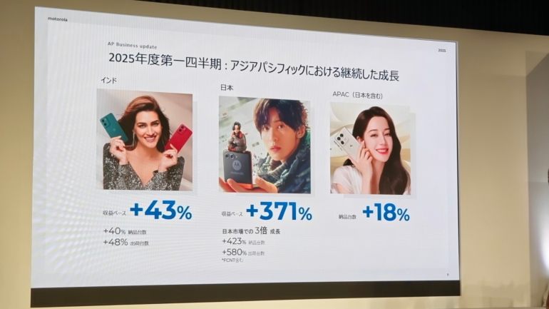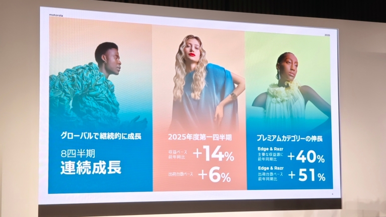 モトローラは、世界の折りたたみスマホを牽引するメーカーだ。折りたたみスマホNo.1の地位を獲得しており、グローバルでは8四半期連続での成長を達成。2025年度第1世半期の収益は、前年同期比で14%増、出荷台数は6%増と、成熟しつつあるスマホ市場においても、好調を維持している。