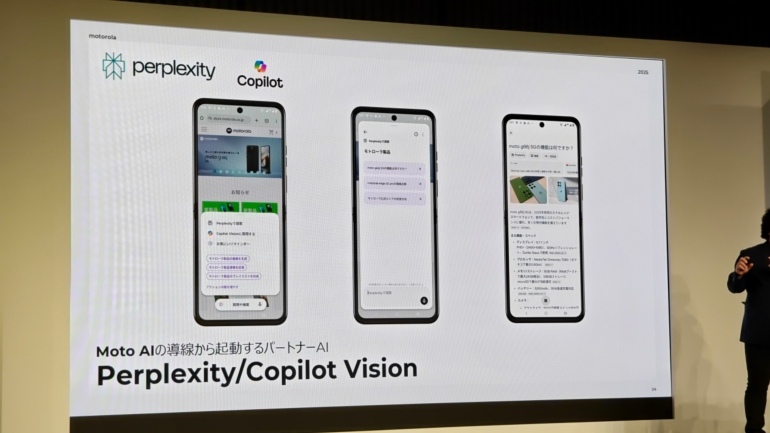 各社が積極的に取り組むAI機能として、モトローラは自社AIを「moto ai」として搭載する。ユニークなのが、独自の機能に加えて、GeminiやPerplexity、Copilotといった各AIとシームレスに繋がり、適材適所で活躍させる「マルチAIプラットフォーム」という取り組みだ。
