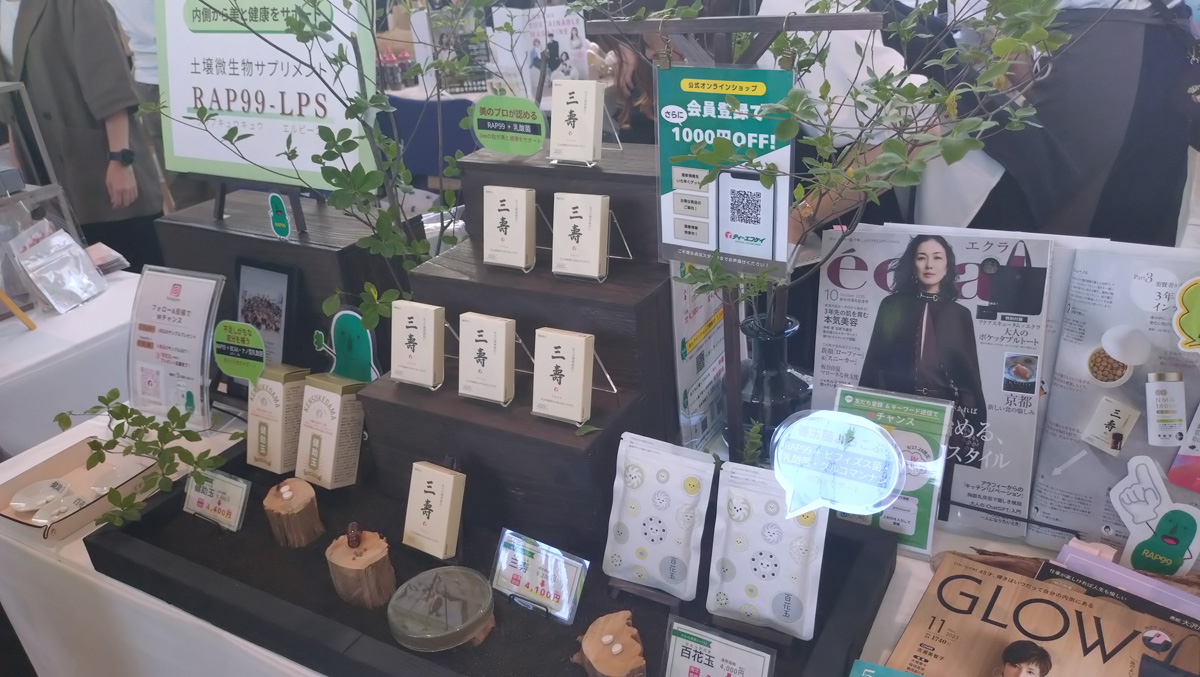 ウェルネス分野では、微生物酵素や光合成細菌RAP99(こうごうせいさいきんらっぷきゅうきゅう)を使用した健康食品などを手がける「ティーエフケイ」も出展している。光合成細菌RAP99は長年の微生物研究の中から選び抜かれた細菌。特徴として、免疫を調整する働きが期待されている。